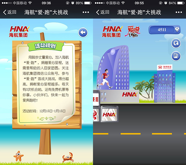 用脚步丈量爱心,加入海航“爱跑”,捐赠爱新里程,送需要帮助的人回家团圆。关注海航集团微信公众账号,参与“爱跑”游戏大挑战,得分越高,捐赠爱心里程越多。每天3次机会哟,还有免费机票等你拿。小伙伴们,快来一起为爱奔跑吧!