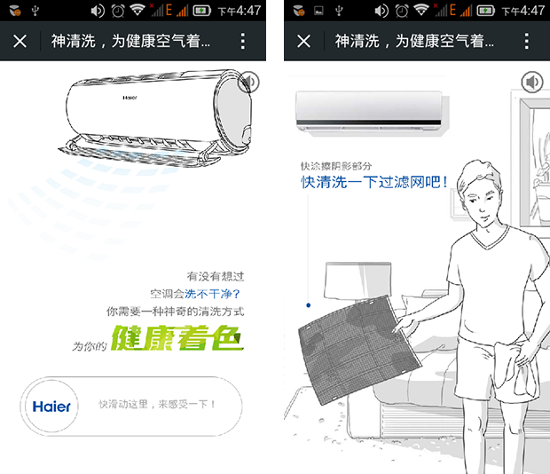 1、点击进入神清洗,为健康空气着色首页,向右滑动西面海尔图标进入清洗过滤网页面。