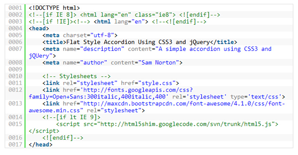 潜水在我们的标记之前,首先我们需要添加一些代码到我们的头上部分。这些措施包括样式表,jQuery库,字体真棒链接和其他一些代码,以使我们的代码工作在一个较旧的浏览器。