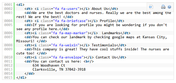 该标记将HTML5的DT(其中包含一个描述列表的标题/名称)和dd(包含DT标签的说明),然后我们会在DL标签包裹的一切。里面的dt的标签,我们还将添加的字体真棒标签。你可以访问这个页面,了解如何让您的首选图标的更多信息。