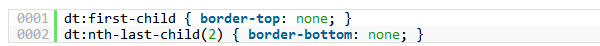 那么,让我们针对dt的第一个孩子和第二个到最后一个孩子,删除边框的顶部和底部边框。