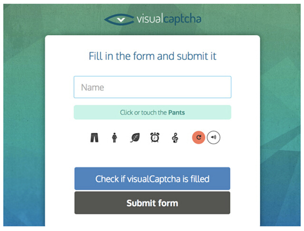 visualCaptcha是一个可配置的验证码解决方案,专注于可访问性和简单性,同时保持安全性。它也支持移动,视网膜装置,并有一个创新的可访问性的解决方案。 visualCaptcha现在可以跨多个后端语言。如果您是使用JavaScript,Ruby或PHP中,你可以使用visualCaptcha。