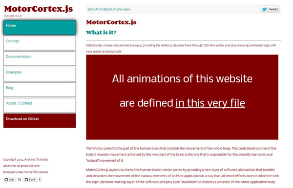 MotorCortex使网页动画轻松,提供通过CSS的语法来形容他们和停止搞乱动画逻辑与实际的javascript代码的能力。 MotorCortex.js渴望通过提供软件一个新的抽象层,它负责处理,并描述一个HTML应用程序的各种要素在所有的计时效果不与逻辑(决策干预的方式运动,以模仿人类大脑的运动皮质层)的软件和加上每个“过渡”被视为整个应用程序本体的每个元素不与单独的问题。而这一切与一个简单而直接的类似CSS的语法和JSAPI,它尊重并匹配了所有的现代MV* JavaScript框架。
