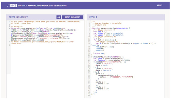 JS尼斯使得即使模糊JavaScript代码的可读性。它是一种新型的统计去模糊化和去微小引擎的JavaScript。给定一个JavaScript程序,JSNice自动建议新的可能的标识符名称和类型。 JSNice采用先进的机器学习和程序分析技术,了解名称和类型规律从大量的可用的开源项目。然后,赋予了新的JavaScript代码,JSNice概率推断新建议的名称和类型的所有局部变量和函数参数。