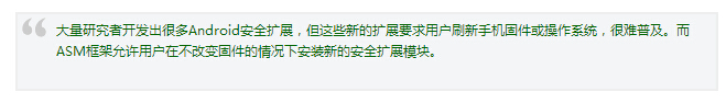 虽然Android系统的联系人过滤和手机权限管理功能并非新鲜事物,但ASM的创新在于可以作为一个公共平台开发和安装所有安全扩展模块,而不仅仅限于联系人和应用权限。ASM能够提升Android系统几乎所有与安全有关的操作的安全性。