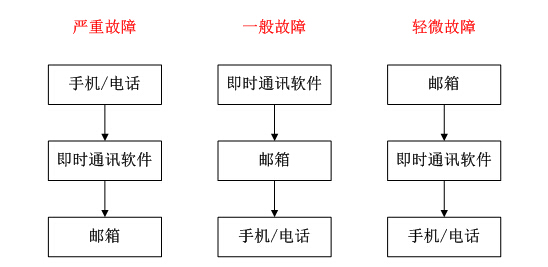 一般说来,在解决软件故障的过程中,所使用的通讯工具包括:手机/电话、即时通讯软件(像QQ、Skype等)、邮箱等。根据软件故障的不同等级,所使用通讯工具的优先级如图1所示。