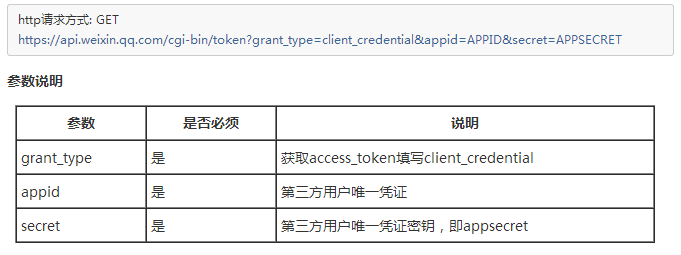 公众号可以使用AppID和AppSecret调用本接口来获取access_token。AppID和AppSecret可在开发模式中获得(需要已经成为开发者,且帐号没有异常状态)。注意调用所有微信接口时均需使用https协议。