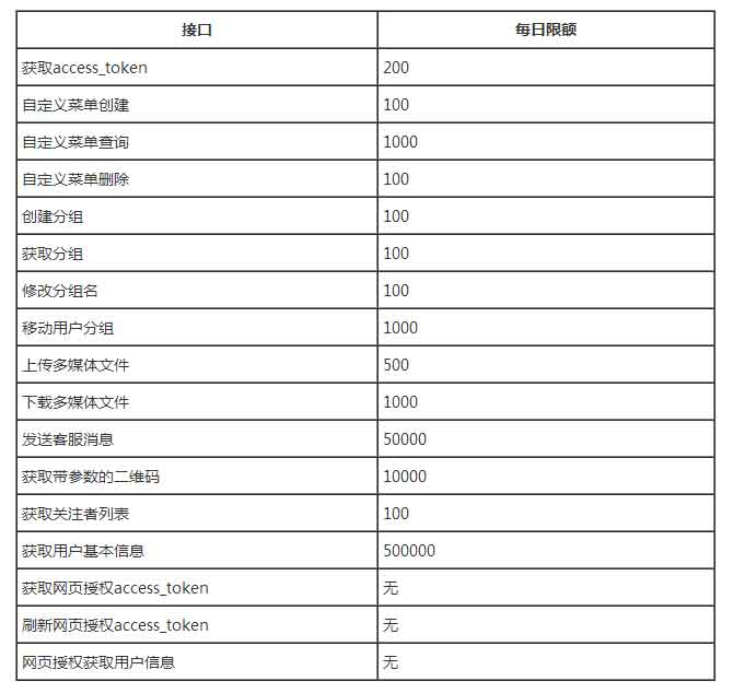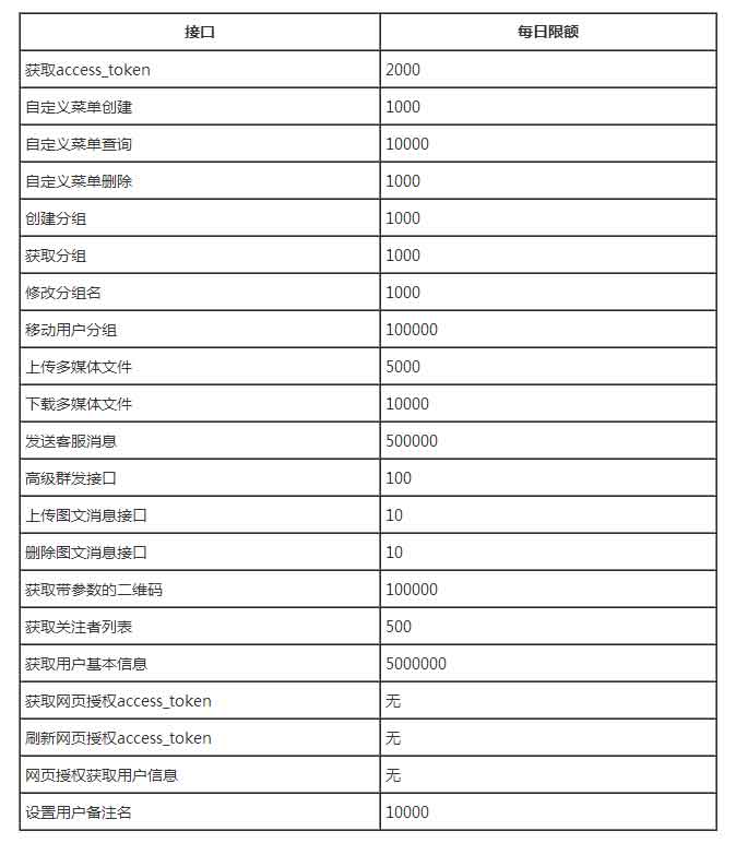 公众号调用接口并不是无限制的。为了防止公众号的程序错误而引发微信服务器负载异常,默认情况下,每个公众号调用接口都不能超过一定限制,当超过一定限制时,调用对应接口会收到如下错误返回码: