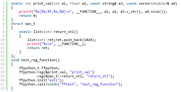 ffpython 可以注册static函数到python中,全局的C风格的static函数和类中定义的static函数都可以被注册到python中,示例如下:
