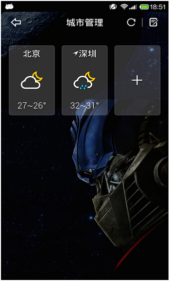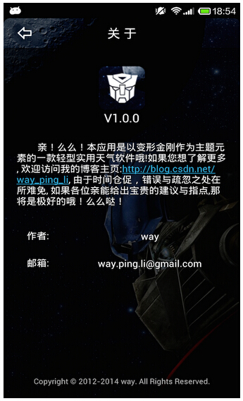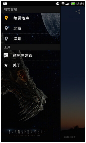 本应用是以变形金刚作为主题元素的实用型Android天气软件,界面高仿雅虎天气,数据来自中国天气网!