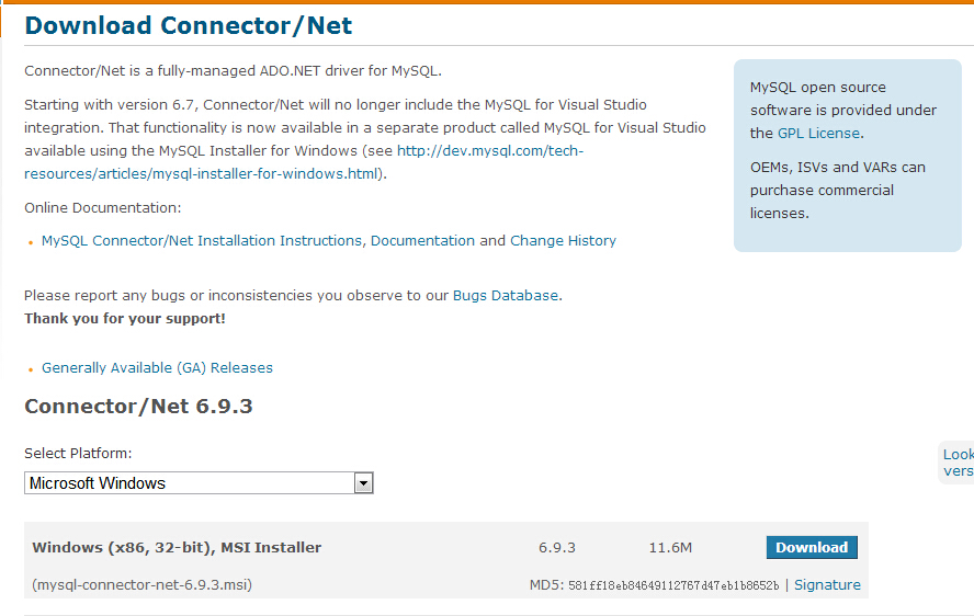 下载地址:http://dev.mysql.com/downloads/connector/net/6.9.html