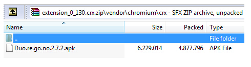 有趣的是这些应用并非手工移植到 Chrome 上的。来自谷歌一名员工的 解释 道:应用代码在 Chrome 平台上运行,特别是在一个原生的客户端内。使用 ARC (Android Runtime for Chrome) 这种方法运行的应用跟从 Chrome Web Store 上下载的并无差别,尽管它们使用的是 Android API 开发的。开发者无需修改代码,尽管需要针对 Chromebook 进行一些应用特性的改进,诸如键盘、触摸板、触摸屏等。下图显示在 Chrome 应用的 CRX 文件中包含了 Android 的 APK 文件。