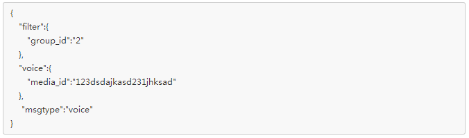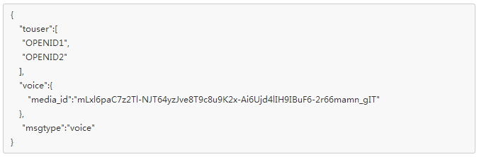 语音(注意此处media_id需通过基础支持中的上传下载多媒体文件来得到):