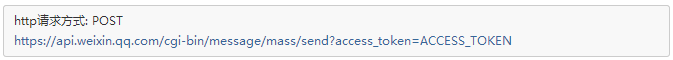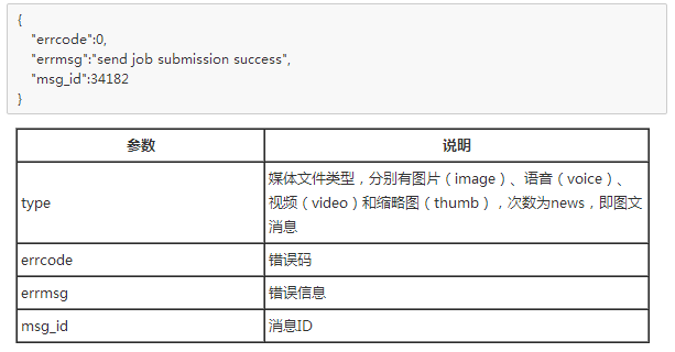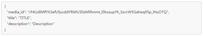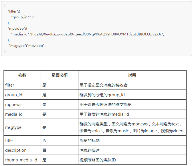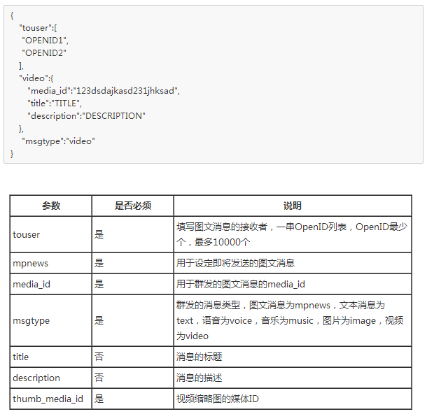 请注意,此处视频的media_id需通过POST请求到下述接口特别地得到:https://file.api.weixin.qq.com/cgi-bin/media/uploadvideo?access_token=ACCESS_TOKEN POST数据如下(此处media_id需通过基础支持中的上传下载多媒体文件来得到):