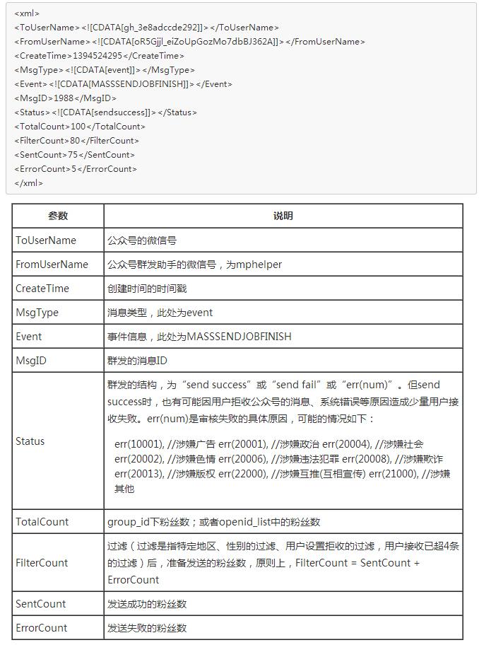 由于群发任务提交后,群发任务可能在一定时间后才完成,因此,群发接口调用时,仅会给出群发任务是否提交成功的提示,若群发任务提交成功,则在群发任务结束时,会向开发者在公众平台填写的开发者URL(callback URL)推送事件。