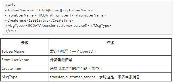 如果公众号处于开发模式,需要在接收到用户发送的消息时,返回一个MsgType为transfer_customer_service的消息,微信服务器在收到这条消息时,会把这次发送的消息转到多客服系统。用户被客服接入以后,客服关闭会话以前,处于会话过程中,用户发送的消息均会被直接转发至客服系统。