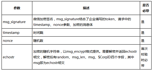 后续回调企业时都会在请求URL中带上以上参数(echostr除外),校验方式与首次验证URL一致。