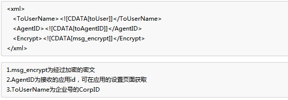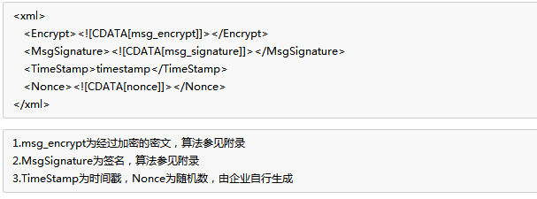 企业号在回调企业URL时,会对消息体本身做AES加密,以XML格式POST到企业应用的URL上;企业在被动响应时,也需要对数据加密,以XML格式返回给微信。企业的回复支持文本、图片、语音、视频、图文等格式。