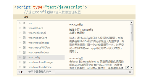下图中敲wxc回车就能生成一段完整的微信API初始化的长长代码,还能给予各种参数的值域提示。