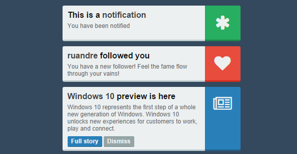 之前我们分享过一款CSS3和jQuery带进度条的消息提示框,今天我们再来分享一款CSS3带图标的消息提示框,提示框的右侧有一个代表性的小图标,非常漂亮。CSS3技术的应用,可以让消息框的四个角都实现圆角效果。