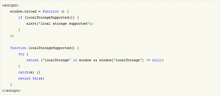 如果要判断是否支持本地存储(local storage),代码可能和下面的类似,但是很容易再Firefox下产生bug。