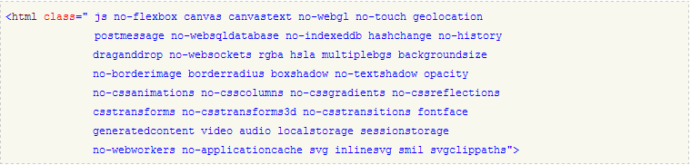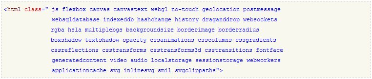 添加完Modernizr引用以后,它就立即生效了。运行的时候它会在html元素上添加一批CSS的class名称,这些class名称标记当前浏览器支持哪些特性和不支持哪些特性,支持的特性就直接显示该天特性的名称作为一个class(例如:canvas,websockets),不支持的特性显示的class是“no-特性名称”(例如:no-flexbox)。下面这段代码是运行在Chrome下的效果: