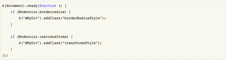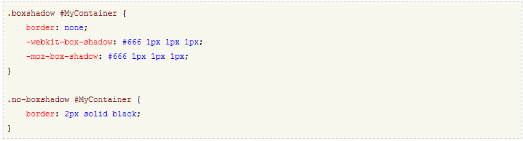 你可以直接使用Modernizr在元素里生成的class名称,在你的css文件里定义相应的属性以便支持当前浏览器。例如,下面的代码可以属性,在支持shadow阴影的浏览器显示shadow,不支持的浏览器显示标准的边框: