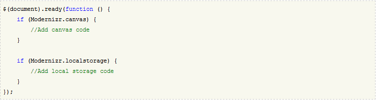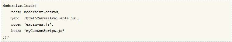 在该例子里,Modernizr会判断当前浏览器是否支持canvas特性,如果支持,那就会加载html5CanvasAvailable.js和myCustomScript.js这两个脚本,如果不支持,就会加载excanvas.js(用于IE9之前的版本)脚本文件以让该浏览器支持canvas功能,然后再加载myCustomScript.js脚本。