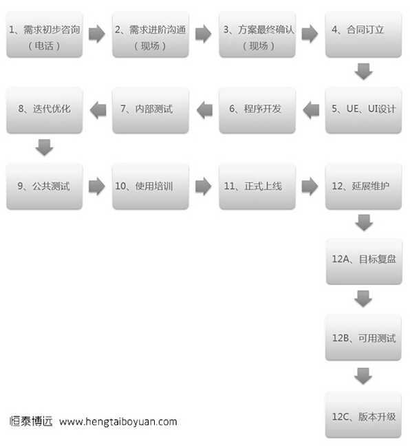 程序设计:在首付款收到的同时,工程师即开展数据库结构设计,当UE、UI完成时即开展程序开发。某些特定的时候,为了项目更快,相应顺序可能会依据经验调整。