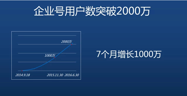 今天在上海的微信公开课上,微信企业号发布了最新用户数据,用户数已突破2000万!距离上次微信企业号公开课专场(当时企业号用户数1000万),仅仅过去了7个月。