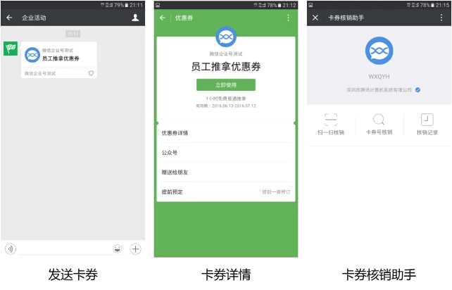 登录【管理端—服务中心—微信卡券】即可开通。该服务向商家提供卡券电子化的能力,商家可在企业号创建卡券,多种渠道投放给用户,用户用券时核销卡券,实现O2O闭环。