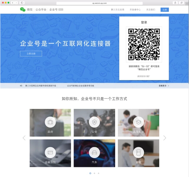 你可以在官网上找到各行各业丰富的企业号案例,以及完整的安全和功能介绍,最新官网请登录qy.weixin.qq.com