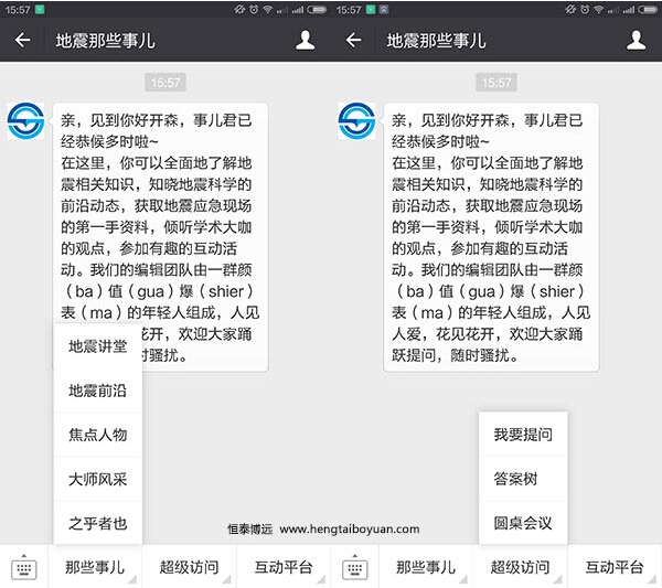 3、互动平台:关于我们、活动推广、地震伐木累、小编有话说。