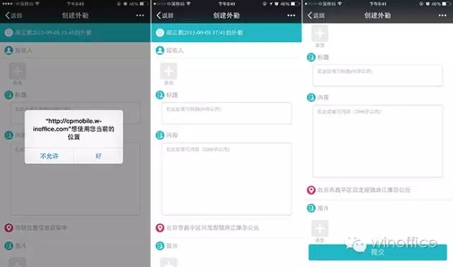 点击创建外勤,进入创建外勤界面,进入弹出获取地理位置的提示,点击好即可,点击添加选取接收人,填写标题,内容,图片。确认无误后,点击提交创建外勤操作完成。