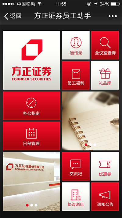 方正证券移动办公方式,功能包括:通讯录、会议查询、员工福利、礼品库、办公指南、日程管理、交流吧、优惠券、协议酒店、通知公告。