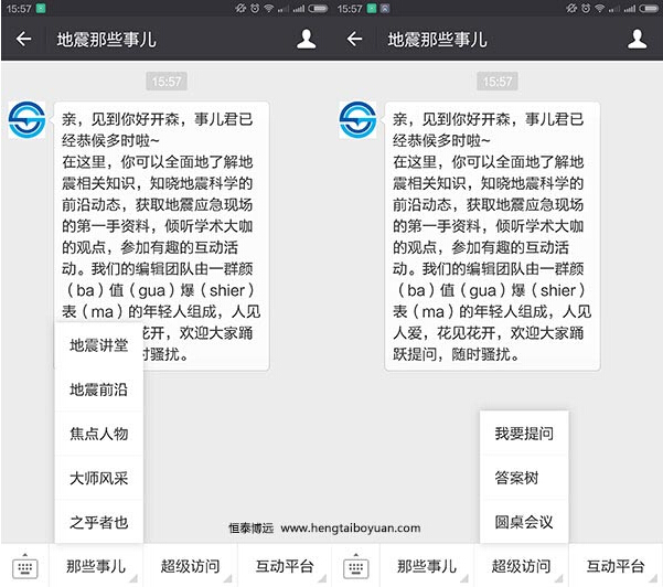 功能:那些事儿:之乎者也、大师风范、焦点人物、地震前沿、地震讲堂;超级访问:圆桌会议、答题树、我要提问;互动平台:关于我们、活动推广、地震伐木累、小编有话说。