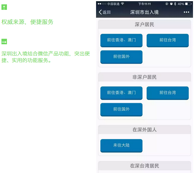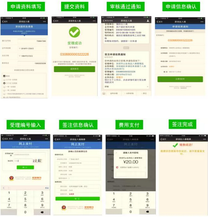 截止2015年5月,“深圳出入境”关注用户超过46万人,使用“微信支付”线上签注金额达2,600,000余万元。