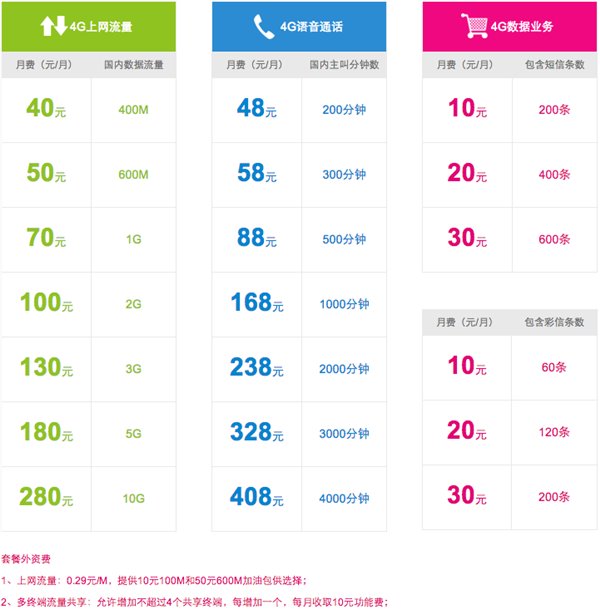 下图是中国移动的4G套餐,从88元到588元,流量从400M到5G,通话时长从200分钟到4000分钟。套餐外资费包括10元/100M和50元/600M的流量包。几乎与3G时代费用相同。不过4G套餐支持多终端共享,可以4台手机共享流量,这点还是相当体贴的。