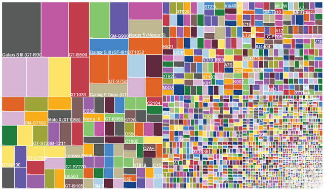 相对于 2013 年,2014 年 Android 机型增加了 60% 至 18679,这个数字更是 2012 年的 4 倍多。此外,设备碎片化情况还可以通过从机型份额占比来了解。去年前 10 大机型的份额占比为 21%,而今年则跌至 15%。