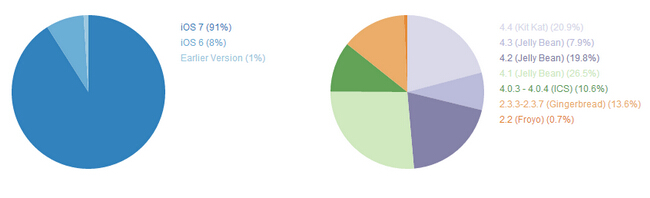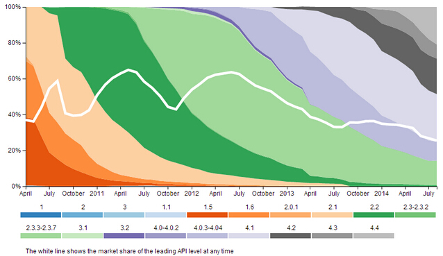 上图表明,机型还不是 Android 碎片化的唯一来源。Android 的不同版本分布情况依然严重。实际上,Android 是有史以来碎片化最严重的操作系统。尽管 4.0 以上版本已经占了 80%,但是最新版的 KitKat(4.4)份额才有 20.9%。相比之下, iOS 7 的普及率已达 91%。