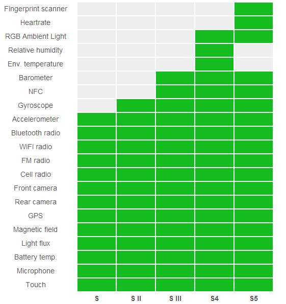 报告还以三星的 S 系列手机内置传感器配置来说明传感器碎片化情况。传感器越来越丰富可以为开发出越来越复杂的应用和网络提供基础。若想了解 Android 设备传感器配置的完整情况可到此处。