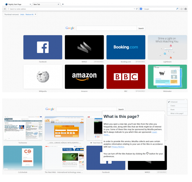 Mozilla 火狐 Nightly 版本集成赞助商瓷贴,Mozilla正在尝试新的广告策略,即在 Nightly版本的火狐浏览器Tab页面当中集成广告商和赞助商瓷贴。用户启动Nightly版本的火狐浏览器之后,会显示有这些广告商和赞助商瓷贴的 页面。当然,Nightl版本的火狐浏览器在标签页面左上角也提供了一次关闭所有瓷贴的按钮,如果用户不爽这些瓷贴,就可以点击这个按钮,从而获得清清爽 爽的空白页面。